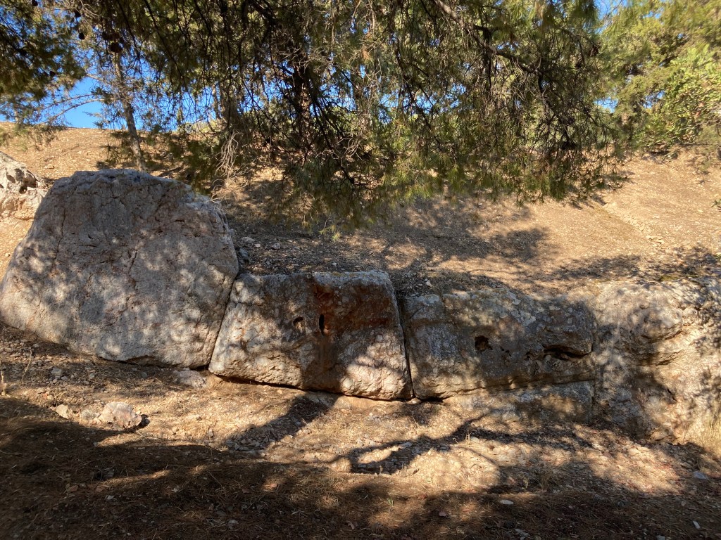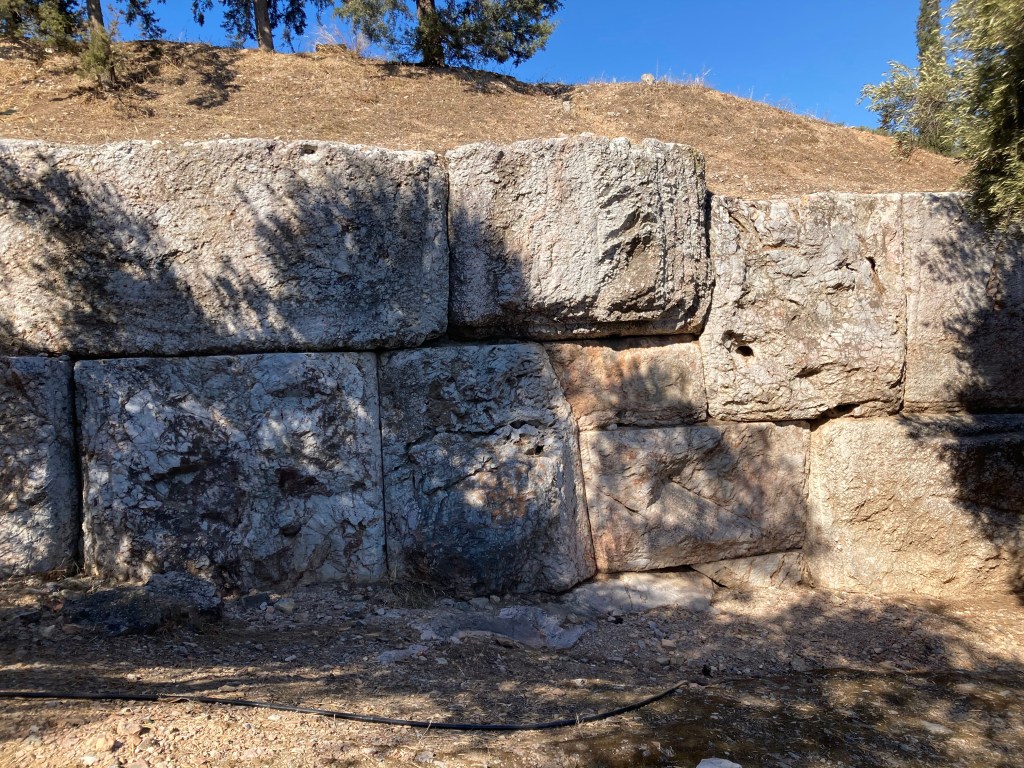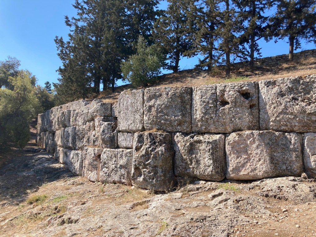Characteristics: The curving retaining wall is made of immense polygonal blocks. Many of which are rectangular with the occasional multi-angled block typical of polygonal masonry. The largest blocks reach nearly two meters in height, width and depth. At almost 5 meters high at its highest point, the wall supported an open space above which was used for political assemblies.