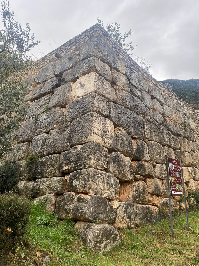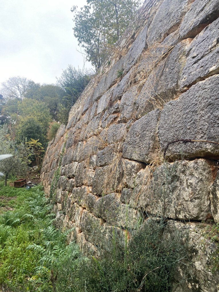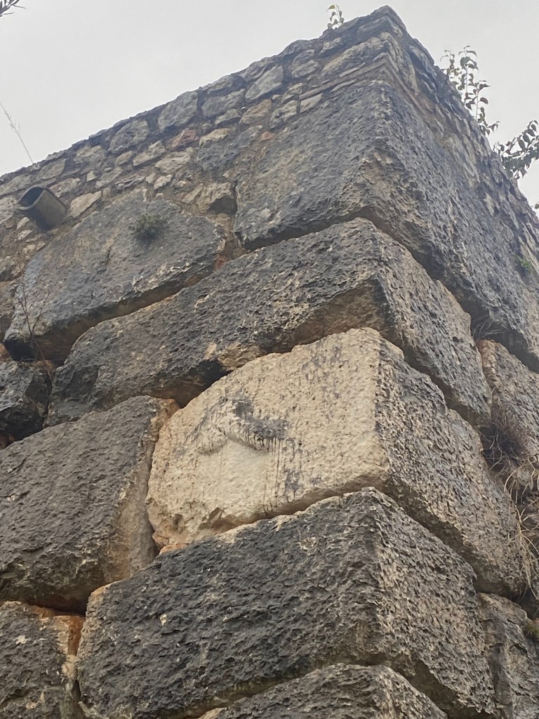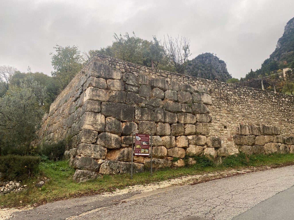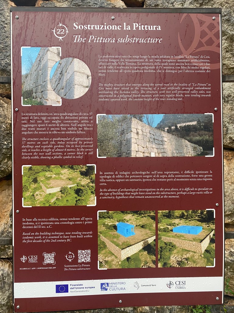 Characteristics: Located on a slope just outside of the small village, Cesi’s singular polygonal wall forms a substantial retaining terrace. The structure is built from moderately large, irregularly shaped limestone blocks. The blocks are carefully fitted with minimal wedge stones, and individual stones measure approximately 1 meter in length. The visible façade suggests deliberate monumentality rather than simple agricultural terracing. Additionally, the platform does not appear to have a deliberate defensive function as no other walls exist in the immediate surroundings. The most famous and intriguing aspect of this wall is the high relief carving of a phallus on the corner block. Often associated with good fortune during the Roman period, this particular symbol is found on a select few polygonal walls throughout Italy, Spain, Greece and Turkey.
