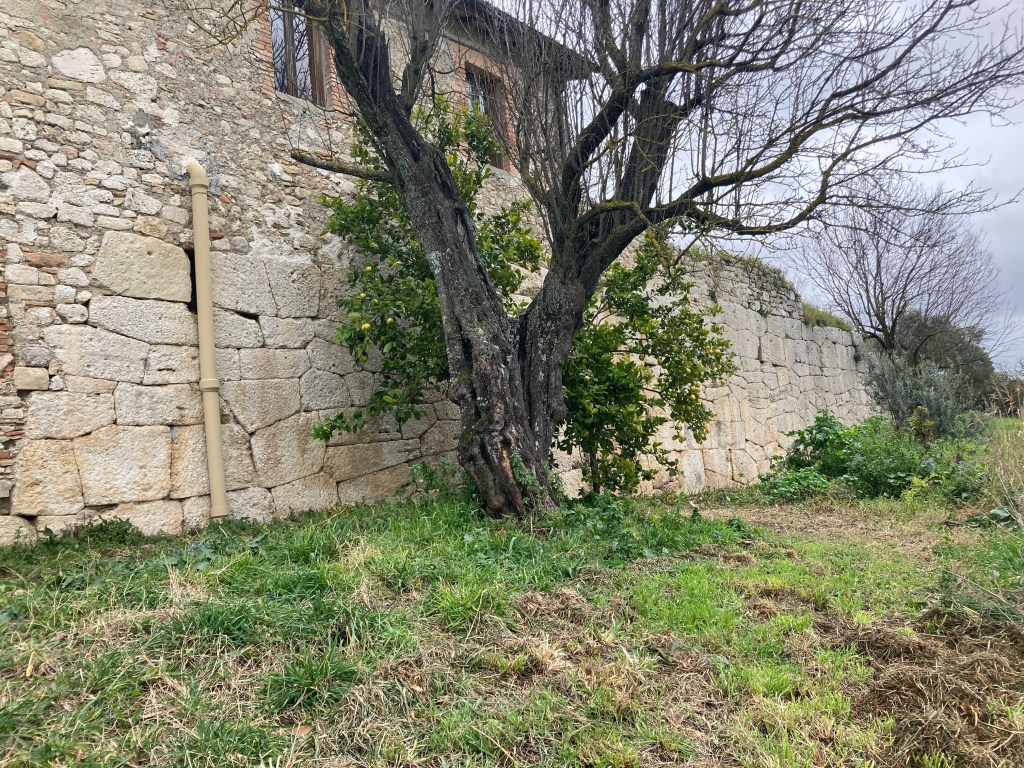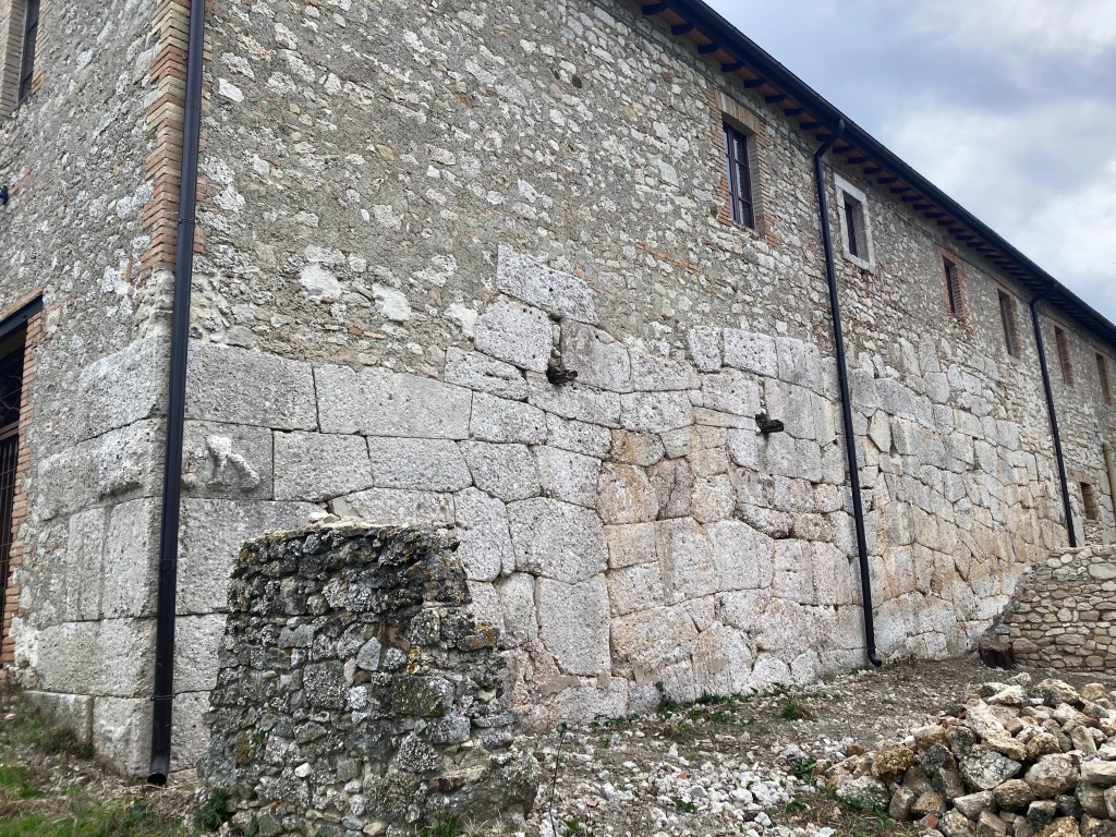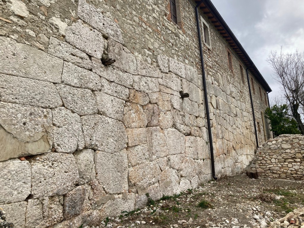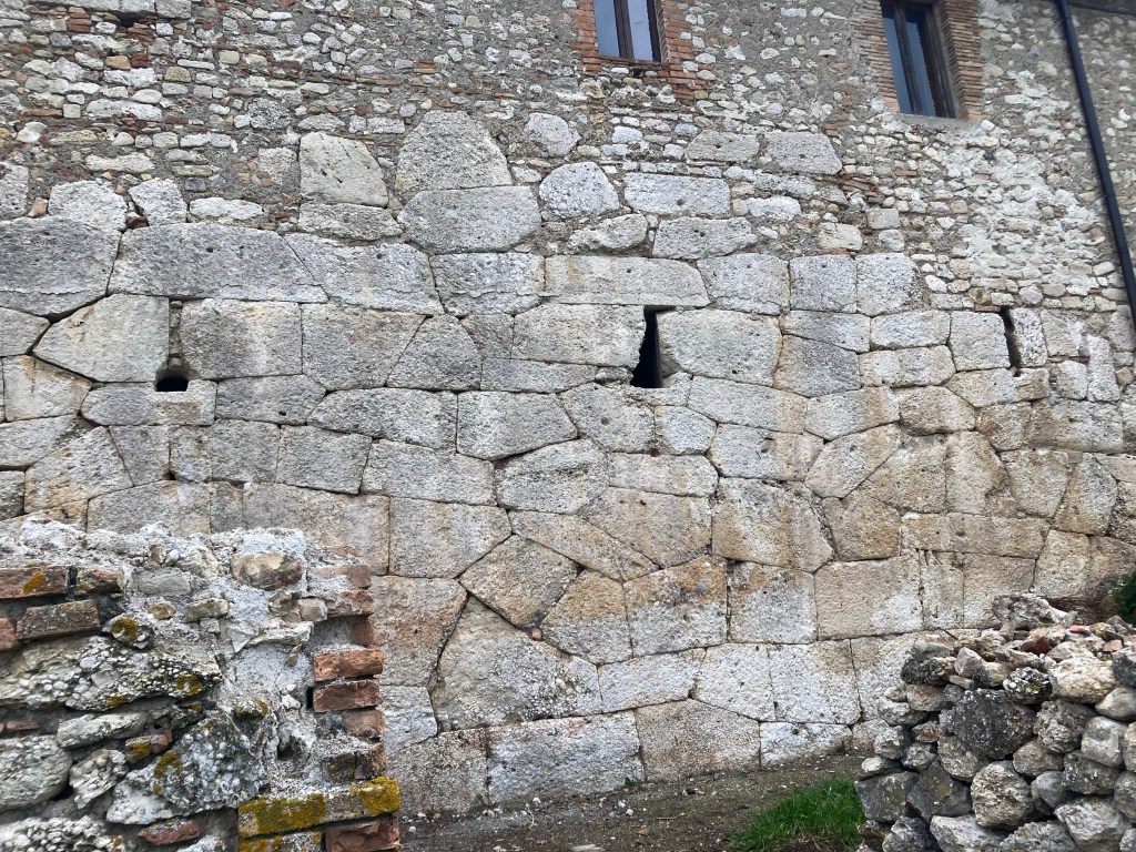 Characteristics: Remains of polygonal walls forming a large rectangular circuit at the hilltop site. Today, the only visible stretch is supporting a modern house and backed by a Roman era grotto. A peculiar feature of the site is a triple phalic symbol on a corner block of the wall.