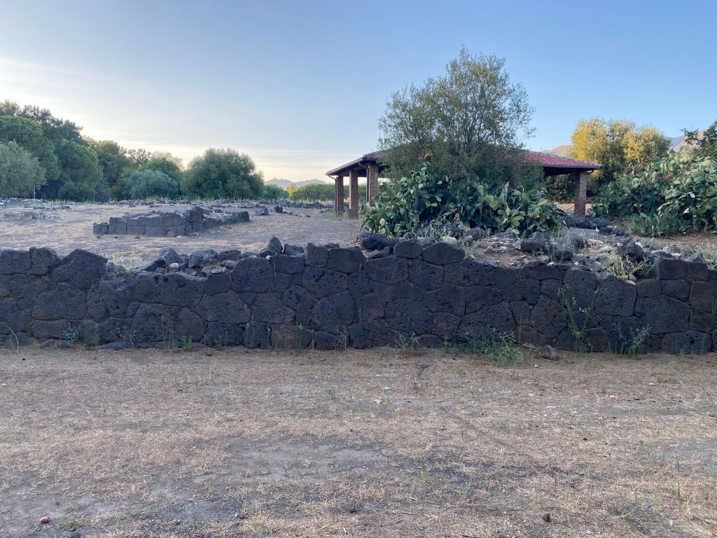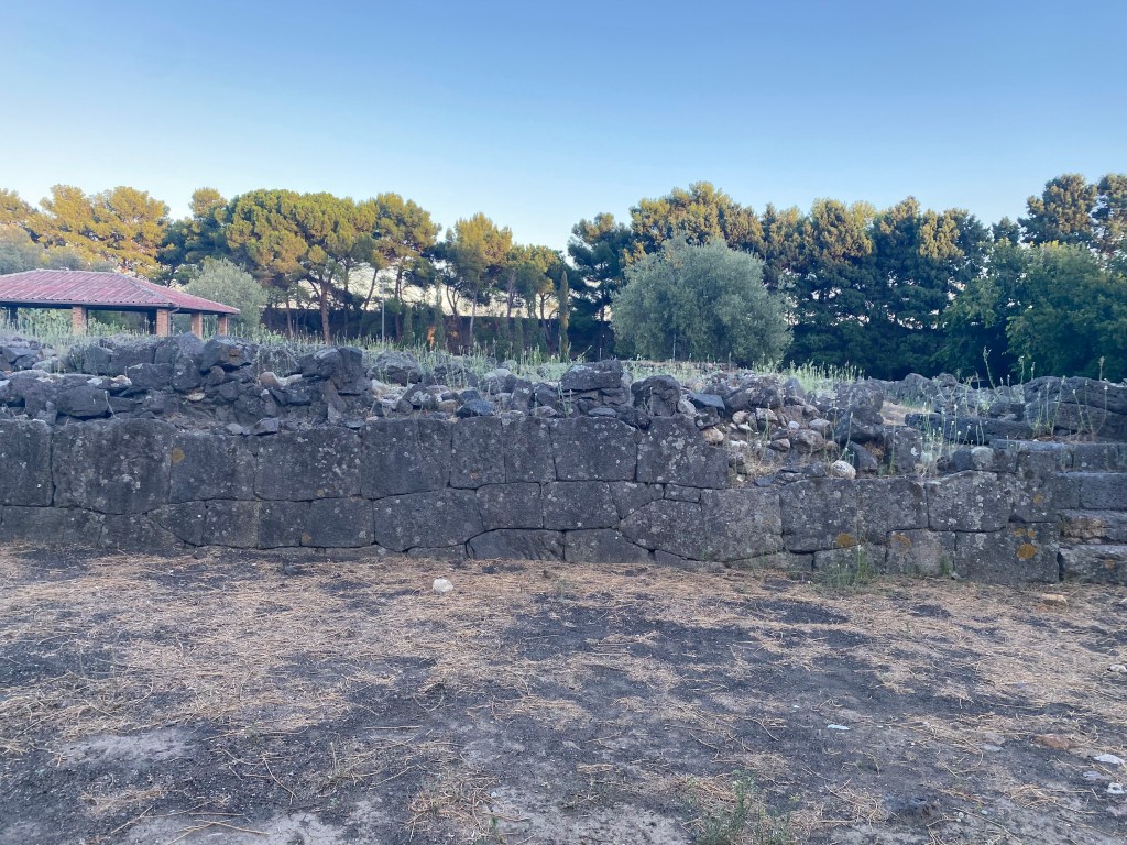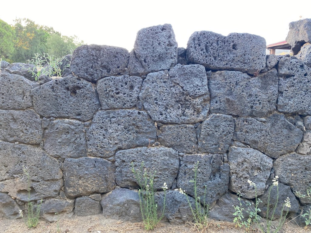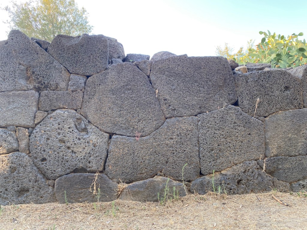 Characteristics: The ancient city was protected by fortification walls built in early polygonal (cyclopean) technique along the promontory’s Santa Venera stream. Blocks were large and made of local volcanic basalt, forming the city’s early defensive perimeter. One particular section of the polygonal wall located at the southwestern-most point of the settlement is made of very precise joinery. Archaeological excavations have revealed that the wall continues for approximately 100 meters before disappearing underground.