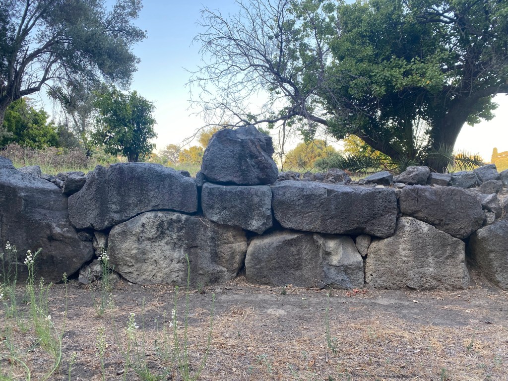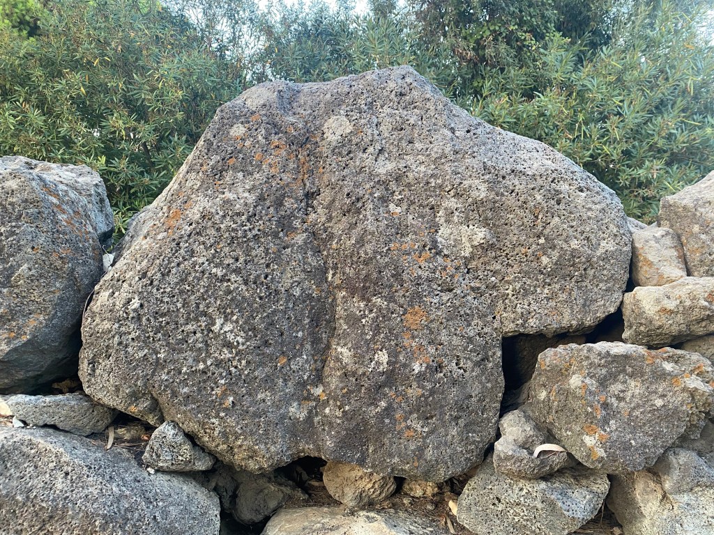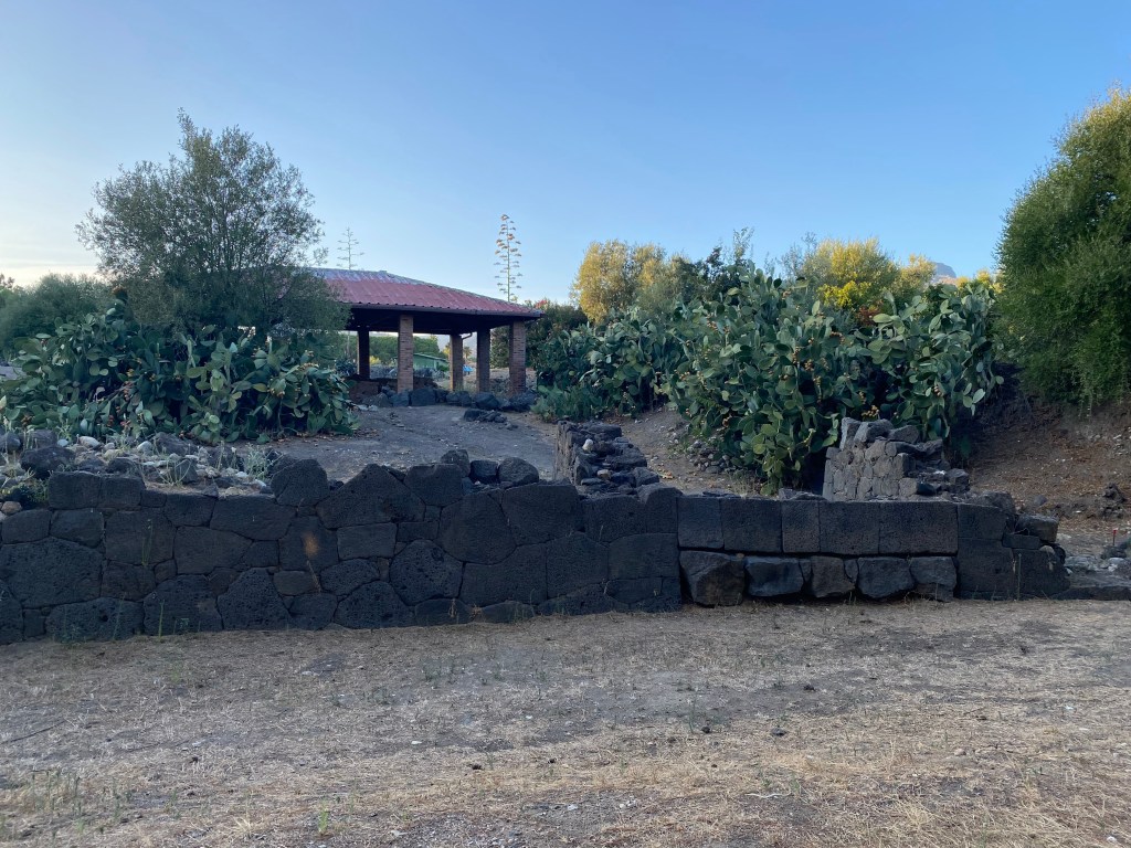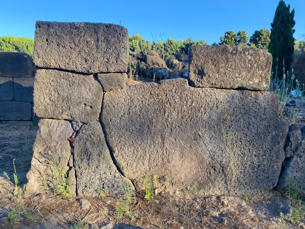 Characteristics: The ancient city was protected by fortification walls built in early polygonal (cyclopean) technique along the promontory’s Santa Venera stream. Blocks were large and made of local volcanic basalt, forming the city’s early defensive perimeter. One particular section of the polygonal wall located at the southwestern-most point of the settlement is made of very precise joinery. Archaeological excavations have revealed that the wall continues for approximately 100 meters before disappearing underground.